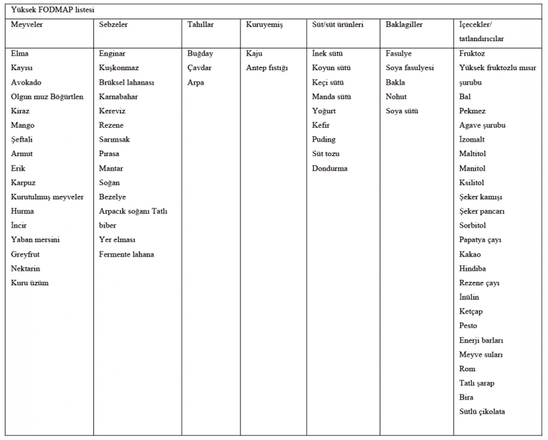 En yüksek oranda FODMAP içeren besinler (içerdikleri karbonhidratlara göre)